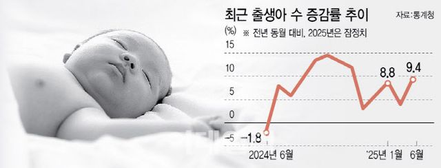 27일 통계청이 발표한 ‘2025년 6월 인구동향’을 보면 6월 출생아 수는 1만 9953명으로 1년 전보다 1709명(9.4%) 증가한 것으로 집계됐다. 12개월 연속 증가다. 합계출산율(여성 1명이 평생 낳을 것으로 예상되는 평균 출생아 수)은 0.76명으로 전년동월대비 0.06명 증가했다. 출생아 수 증가율은 2분기와 상반기 기준으로도 각각 7.3%(4157명), 7.4%(12만 6001명)이 늘며 역대 최고치를 찍었다.