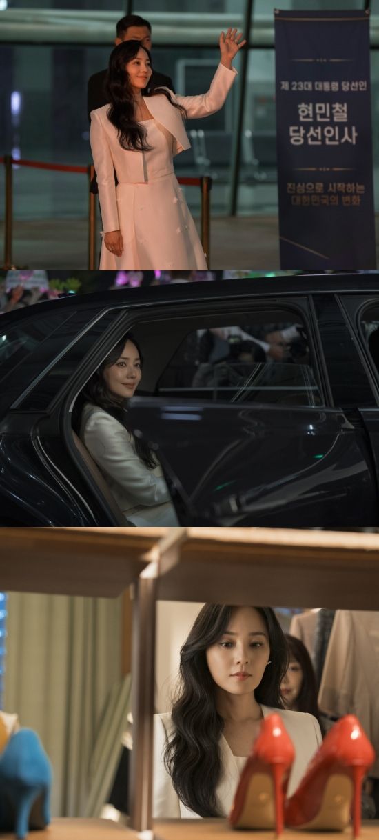 이와 관련 유진이 ‘퍼스트레이디’이자 머리부터 발끝까지 완벽한 육각형 킹메이커다운 위풍당당 카리스마를 드리운 첫 포스로 시선을 강탈한다. 극 중 차수연이 시민들에게 답례로 손을 흔드는가 하면 차에 올라타 퍼스트레이디다운 자태를 드러낸 장면. 차수연은 고급스럽고 세련된 화이트 정장과 자연스러운 헤어스타일, 은은하게 빛이 나는 메이크업으로 엣지있는 스타일을 완성, 퍼스트레이디의 품격을 증명한다. 무엇보다 차수연은 시종일관 우아한 미소와 단아한 표정을 잃지 않는 모습으로 앞으로 퍼스트레이디로서의 행보에 대한 기대감을 드높인다. 과연 행복해 보이는 정육각형 킹메이커 차수연에게 어떤 사건들이 펼쳐질지 궁금증이 모인다.