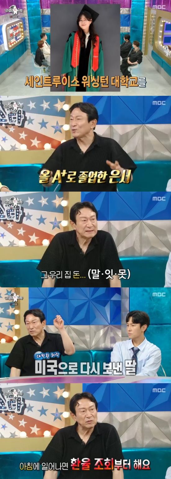 김응수는 "은서가 세인트루이스 워싱턴 대학교를 올 A+로 졸업했다. 전공은 심리학이다. 졸업하고 한국으로 돌아왔는데, 은서가 아쉬워하면서 대학원을 가겠다더라. 은서 얘기를 들어보니 맞는 말 같아서 다시 미국으로 출국을 했다. 학비가 많이 들어간다. 아침에 일어나면 환율 조회부터 한다"면서 한숨을 쉬어 웃음을 자아냈다.