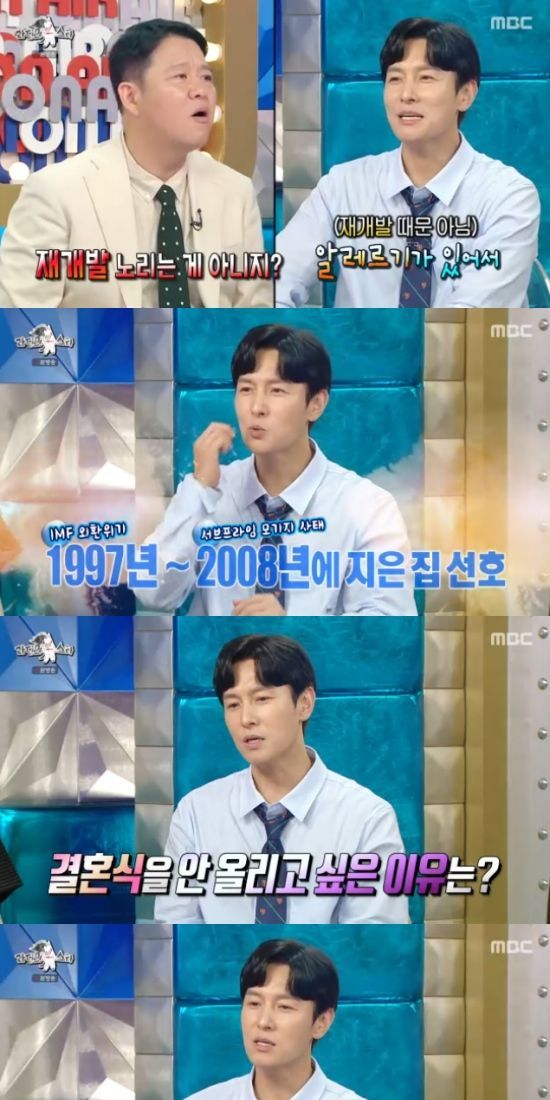 김동완은 "일단 제가 알레르기 때문에 신축 아파트에서는 살지 못한다. 20년 정도 된 구축 아파트에 살아야하고, 결혼식을 하지 않을 것"이라고 조건을 말했다.