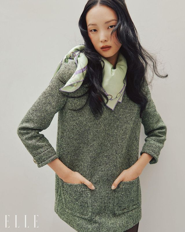 포켓 디테일의 그린 미니드레스와 그린 앤 퍼플 스카프는 모두 Gucci. 스타킹은 에디터 소장품.