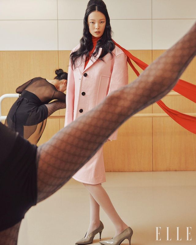 윤서가 착용한 핑크 나파 레더 재킷과 보 디테일의 레드 슬리브리스 실크 하이넥 톱, 백 슬릿 디테일의 핑크 나파 레더 펜슬 스커트, 그레이 페이턴트 미드 힐 펌프스는 모두 Gucci. 스타킹은 에디터 소장품. 무용수가 신은 모노그램 타이츠는 모두 Gucci.