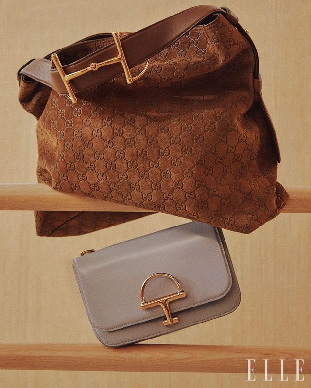 (위) 맥시 홀스빗 스트랩 디테일의 페퍼 브라운 라지 스웨이드 모노그램 호보 백은 Gucci. (아래) 하프 홀스빗 클로저 디테일의 그레이 레더 스몰 숄더백은 Gucci.