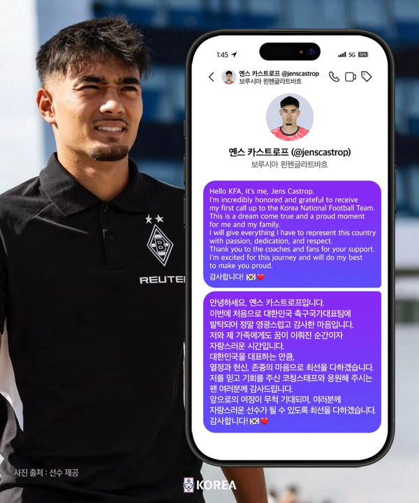 카스트로프는 홍명보호에 승선한 이후 축구협회를 통해 발탁 소감을 전했다. 지난 27일 축구협회 공식 소셜미디어(SNS)를 통해 “이번에 처음으로 대한민국 축구 국가대표팀에 발탁돼 정말 영광스럽고 감사한 마음이다. 나와 내 가족에게도 꿈이 이뤄진 순간”이라며 “대한민국을 대표하는 만큼 열정과 헌신, 존중의 마음으로 최선을 다하겠다”라는 포부를 밝혔다.