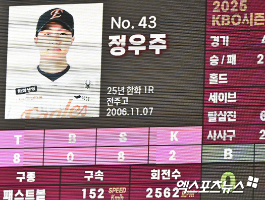 (엑스포츠뉴스 고척, 조은혜 기자) 한화 이글스 정우주가 메이저리그 스카우트 11개 팀이 모인 앞에서 KBO 역사에서도 드물었던 '9구 K-K-K' 장면을 만들어냈다.