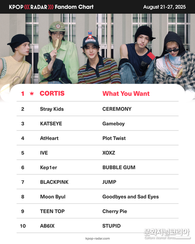 문화저널코리아 김영일 기자 | 빅히트 뮤직 신인 보이그룹 코르티스가 ‘케이팝레이더(K-POP RADAR)’ 위클리 팬덤 차트 정상에 올랐다.