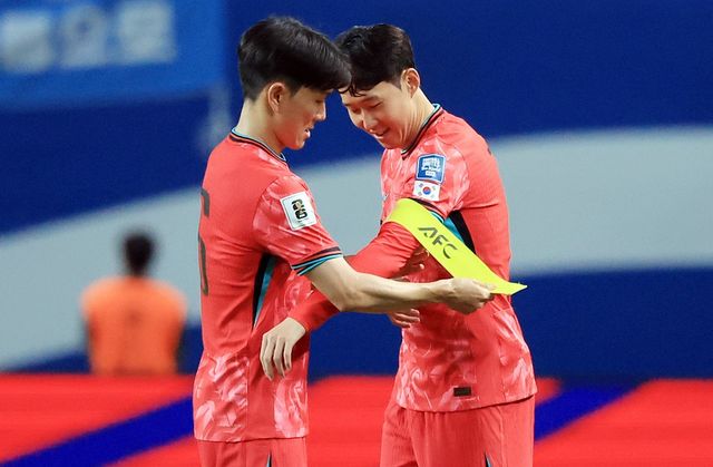 한국 축구대표팀의 황인범이 후반 교체 출전하는 손흥민에게 주장 완장을 채워주고 있다. 기사 이해를 돕기 위한 자료 사진.대한축구협회(회장 정몽규)는 종아리 근육을 다친 황인범의 대체 선수로 서민우(강원 FC)를 발탁했다고 29일 공식 발표했다. / 뉴스1