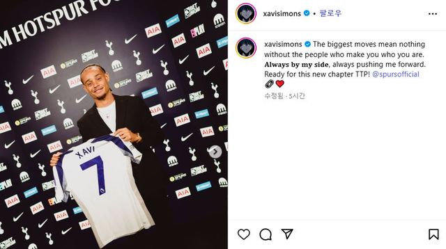 그는 "토트넘에서 뛰는 것은 오랫동안 꿈꿔온 순간이었다. 토마스 프랑크 감독과 이야기를 나눈 후 이 팀이 나에게 가장 적합하다는 걸 느꼈다. 팀과 팬들을 위해 최선을 다하겠다"고 밝혔다.