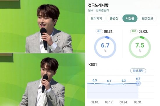 (엑스포츠뉴스 이정범 기자) 이찬원이 출연한 '전국노래자랑'이 시청률 6.7%를 기록했다.