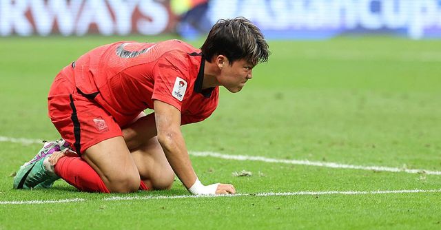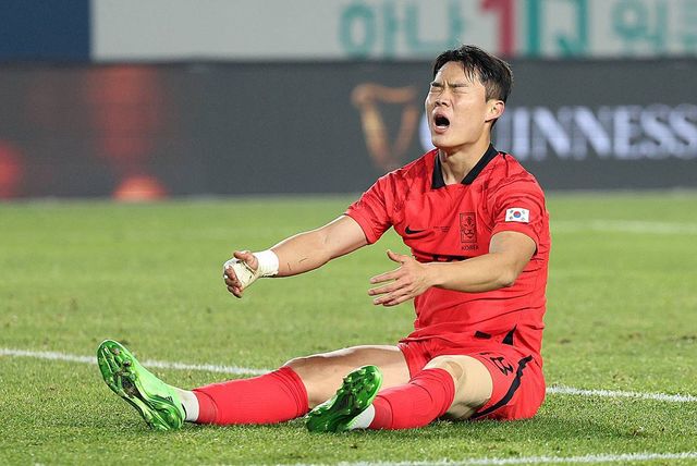 대한민국 축구대표팀 오현규가 지난해 1월 25일(현지시간) 카타르 알와크라 알자누브 스타디움에서 열린 2023 아시아축구연맹(AFC) 카타르 아시안컵 조별리그 E조 조별리그 3차전 대한민국과 말레이시아의 경기에서 말레이시아 수비에 의해 넘어진 후 고통을 호소하고 있다 / 뉴스1