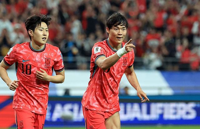 지난 6월 10일 오후 서울 마포구 상암동 서울월드컵경기장에서 열린 2026 국제축구연맹(FIFA) 북중미 월드컵 아시아 3차 예선 B조 10차전 대한민국과 쿠웨이트의 경기, 대한민국 오현규가 후반 팀의 세 번째 골을 넣은 뒤 환호하고 있다 / 뉴스1