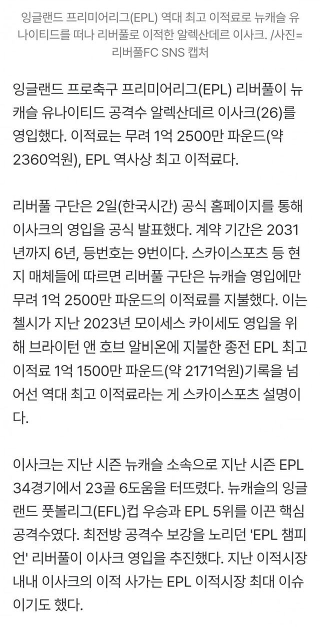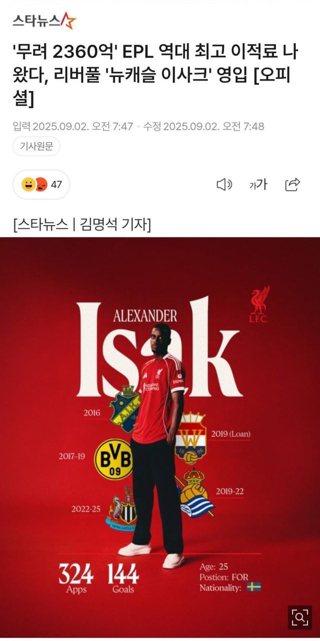 2025년 9월 2일, 리버풀은 알렉산드르 이삭을 무려 1억 2500만파운드, 한국돈 2356억원에 사들였다.
