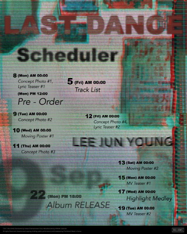 스케줄러에 따르면 오는 5일 ‘라스트 댄스’의 트랙리스트가 공개돼 본격적인 컴백 시동을 걸고, 8일 정오부터 온라인 음반 사이트에서 피지컬 앨범 예약 판매가 시작된다. 이준영의 눈부신 비주얼이 담긴 콘셉트 포토가 네 가지 버전으로 다채롭게 공개되며, 두 가지 버전의 무빙 포스터가 신보 무드를 생동감 있게 전달할 예정이다.