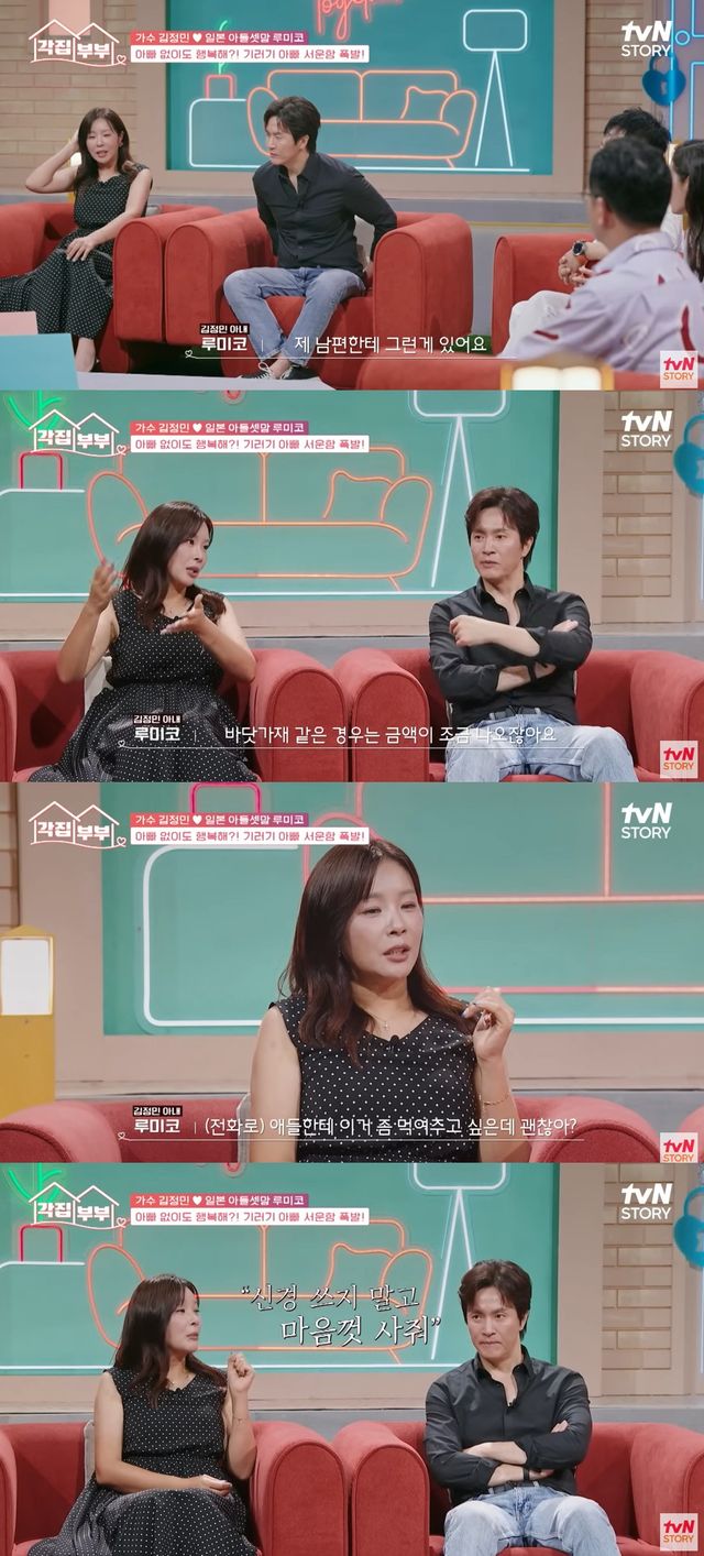 4일 방송한 tvN STORY '각집부부'에는 김정민과 루미코 부부가 출연해 한국과 일본에서 따로 사는 근황을 전했다.