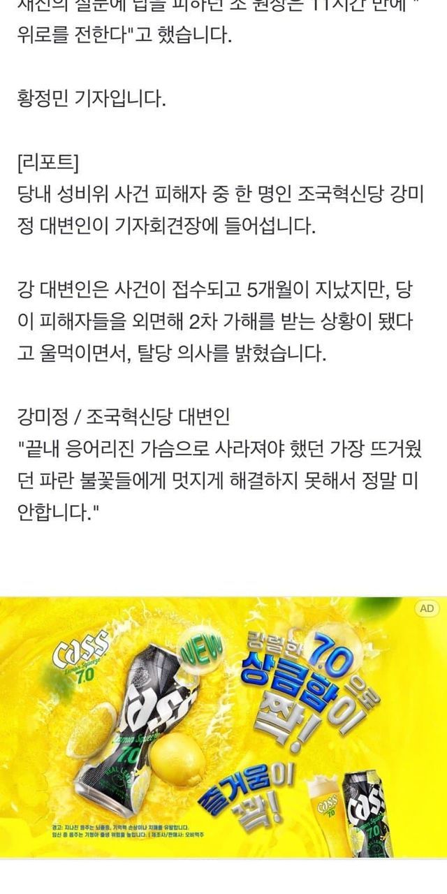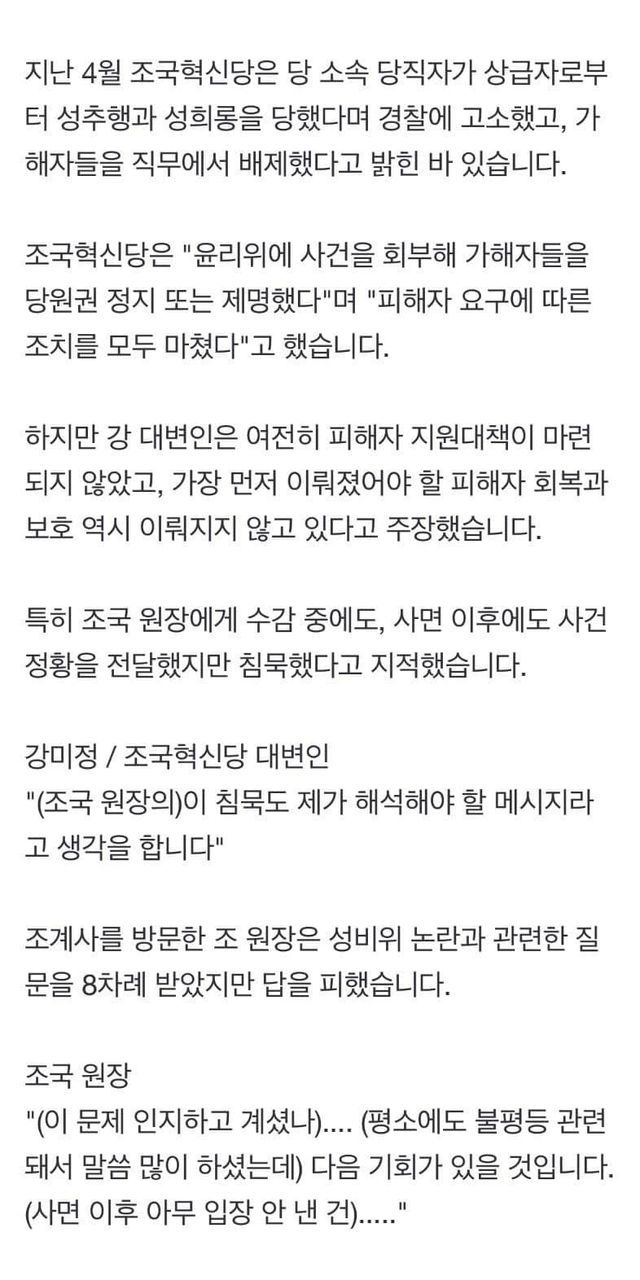 조국, 강미정 폭로에 첫 입장 "수감 당시 비당원 신분이라 할 수 있는 역할 없었다, 관용 없는 처벌·피해 회복 제도화 위해 노력할 것"
