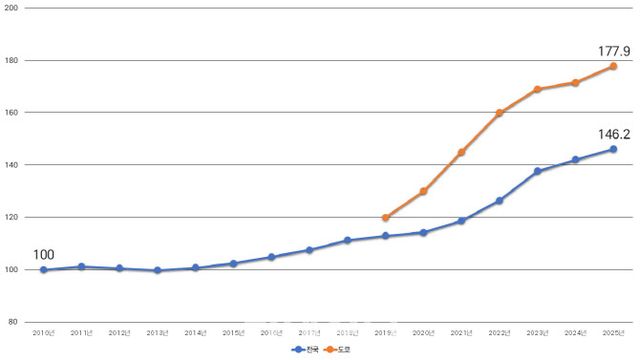 흥미로운 점은 일본조차 지금은 장기 불황이라고 보기 어렵다는 사실이다. 2025년 7월 기준 일본 주택종합지수는 143.8로 전년 대비 2.9% 상승했고, 맨션 지수는 215.6으로 7.1%나 올랐다. 도쿄 23구의 평균 임대료는 6.1% 상승했으며, 특히 패밀리형 주택은 7.5%나 올랐다. 신축 단독주택 성약 건수는 전년 대비 222.7% 증가했고, 가격은 17개월 연속 상승세다. 공급은 10개월 연속 감소했으며, 건축비 지수는 철근콘크리트 54개월, 목조 주택 97개월 연속 상승했다. 이는 일본조차 지금은 매매와 임대가 모두 상승하는 국면에 있음을 보여준다.