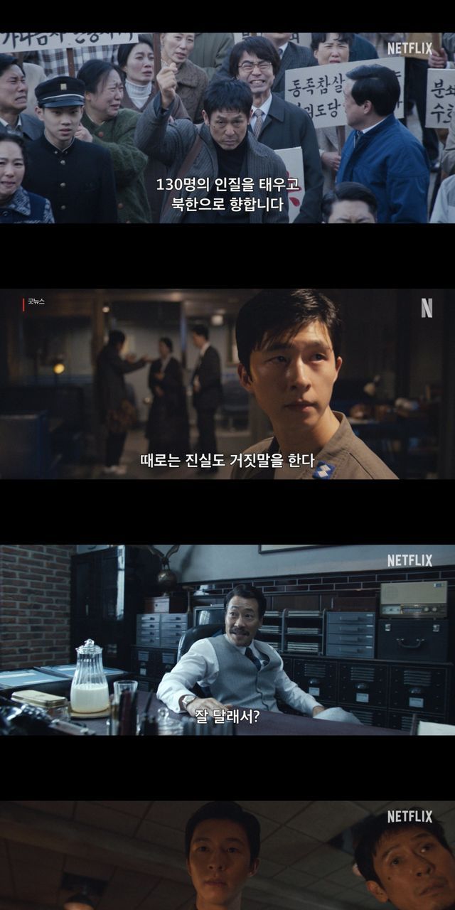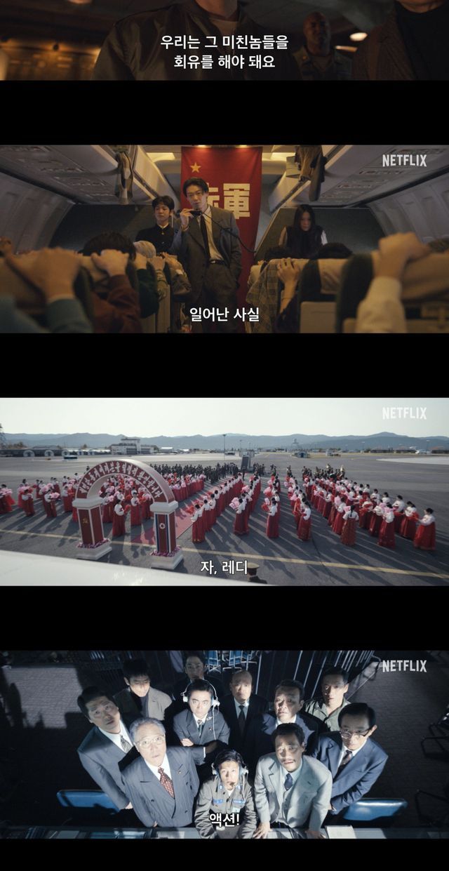 공개된 티저 예고편은 평양을 향해 날아가는 일본 여객기를 지상에서 하이재킹해야만 하는 이들의 기상천외한 작전을 담아내 이목을 집중시킨다. 모두의 운명이 걸린 일촉즉발의 상황, 정체불명의 해결사 아무개(설경구)에게 중앙정보부장 박상현(류승범)은 어떻게든 이 사건을 잘 수습할 것을 명령한다. 이에 그 방법을 묻자, “잘 달래서”라는 황당한 답변이 돌아오며 ‘굿뉴스’ 만의 허를 찌르는 신선한 유머 감각을 엿보게 한다. 한편, “그럼 여기가…북한이라고 해도 되겠습니까”라며 기발하고도 위험한 아이디어를 제시하는 엘리트 공군 중위 서고명(홍경)은 절체절명의 임무에 내적 갈등을 겪는 모습으로, 과연 그가 작전을 무사히 성공시킬 수 있을지 호기심을 증폭시킨다. 또한, 김포를 평양으로 바꾸는 엄청난 스케일의 작전을 설계하고 지휘하는 아무개의 모습과 어우러진 “거짓말 같은 뉴스” 라는 카피는 한 치 앞을 예측할 수 없는 이야기를 기대하게 한다. 여기에 아무개와 서고명, 박상현, 그리고 일본 운수정무차관 신이치(야마다 타카유키) 등 하이재킹 사건으로 모인 이들이 심각한 표정으로 어딘가를 응시하는 모습은 독특한 분위기를 자아내며, 유니크한 연출로 위트있게 담아낸 흥미진진한 스토리를 향한 기대감을 고조시킨다.