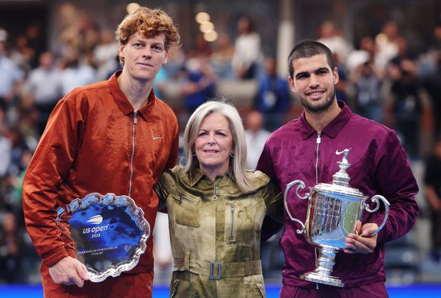 NEW YORK, NEW YORK - SEPTEMBER 07: (Left to right) Jannik Sinner of Italy, Stacey Allaster Chief Executive of Professional Tennis and US Open Tournament Director, Carlos Alcaraz of Spain pose with their trophies after defeating during their Men's Singles Final match on Day Fifteen of the 2025 US Open at USTA Billie Jean King National Tennis Center on September 07, 2025 in New York City. Clive Brunskill/Getty Images/AFP (Photo by CLIVE BRUNSKILL / GETTY IMAGES NORTH AMERICA / Getty Images via AFP)/2025-09-08 09:08:28/ <저작권자 ⓒ 1980-2025 ㈜연합뉴스. 무단 전재 재배포 금지, ai 학습 및 활용 금지>