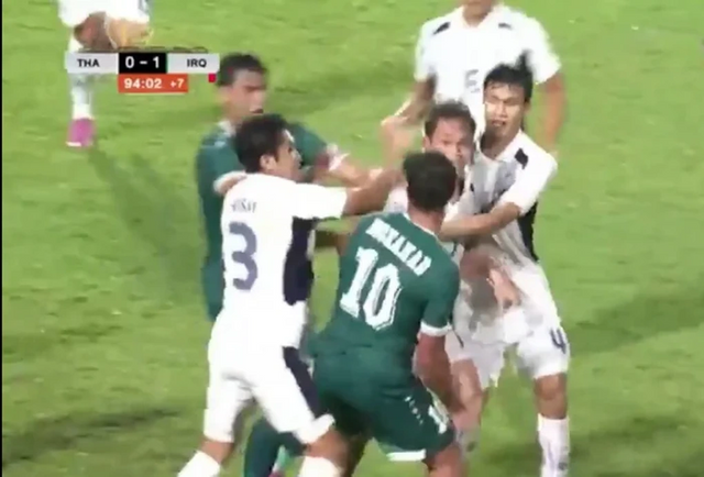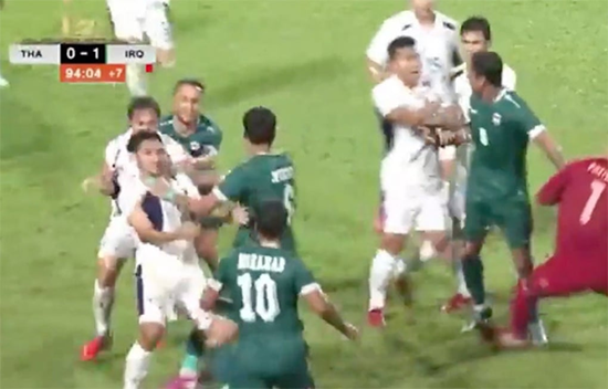 (엑스포츠뉴스 나승우 기자) 이라크와 태국의 A매치 경기에서 나온 비신사적 태클로 양 팀 선수들이 몸싸움을 벌이는 일이 발생했다.