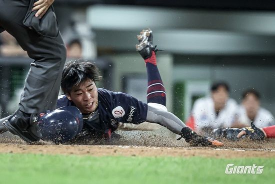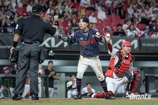 롯데는 8회초 1사 뒤 박찬형과 전민재의 연속 안타로 1사 1, 3루 추가 득점 기회를 만들었다. 3루에 대주자 김동혁이 위치한 가운데 후속타자 장두성의 포수 앞 땅볼이 나왔다. 김동혁이 과감하게 홈을 파고들었지만, 곧바로 공을 집어 들어 태그를 시도한 상대 포수 김태군의 플레이에 아웃 선언을 받았다.
