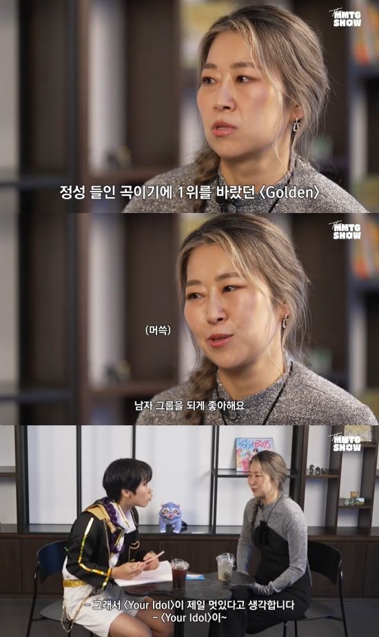 매기 강 감독은 최근 빌보드 핫100 차트에서 1위를 유지하고 있는 'Golden'과 스포티파이 차트에서 1위를 차지한 'Your Idol' 중 어떤 곡을 제일 좋아하냐는 말에 "'Golden' 쓰는 게 되게 힘들었다. 제일 어려운 곡이기도 해서 조금 특별한 애착이 있다"고 답했다.