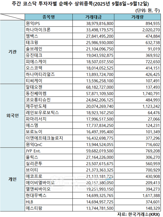 기관 '원익IPS'·외인 '알테오젠'·개인 'JYP Ent.' 1위 [주간 코스닥 순매수- 2025년 9월8일~9월12일]