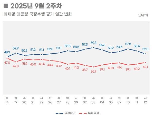 일간으로는 지난 금요일(5일) 53.2%(부정 평가 40.8%)로 마감한 후, 9일(화)에는 54.5%(1.3%P↑, 부정 평가 41.6%), 10일(수)에는 57.8%(3.3%P↑, 부정 평가 39.1%)까지 상승했으나, 이재명 대통령의 취임 100일 기자회견이 있었던 11일(목)에는 55.4%(2.4%P↓, 부정 평가 40.2%)로 하락했고, 12일(금)에는 52.0%(3.4%P↓, 부정 평가 42.1%)로 추가 하락했다.