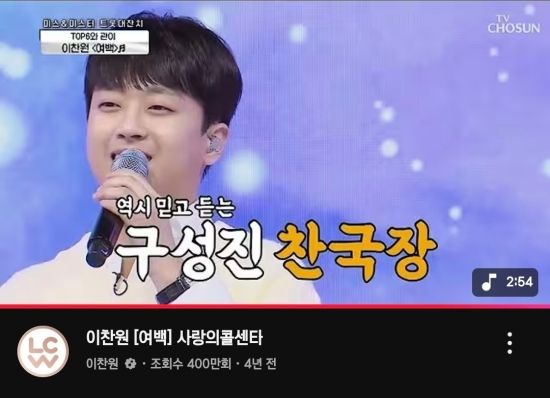 (엑스포츠뉴스 이정범 기자) 이찬원의 '여백' 무대가 유튜브 조회 수 400만 뷰를 넘어섰다.
