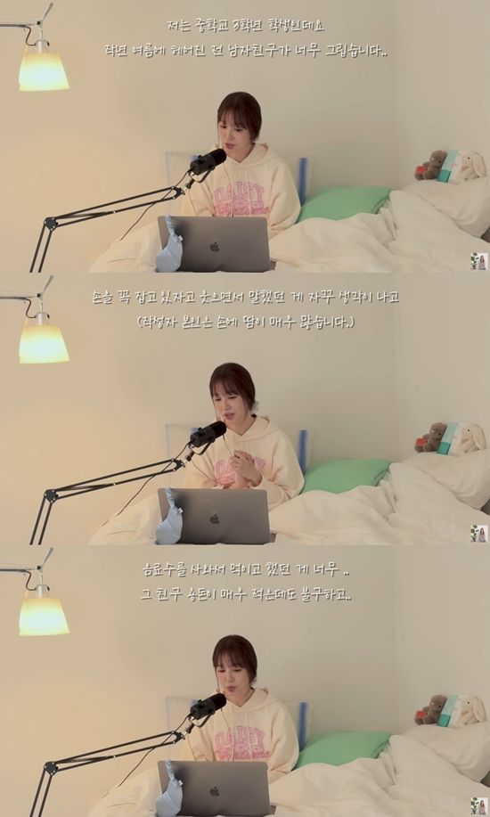 이어 "걔랑 같이 '빵지순례'를 하는데 걔가 자꾸 덥지는 않냐고 손으로 부채질을 해 주고, 그 친구 용돈이 매우 적은데도 불구하고 음료수를 사 와서 먹이고 했던 게 너무 감동이었다"고 전하며 풋풋한 연애 이야기를 공개했다.