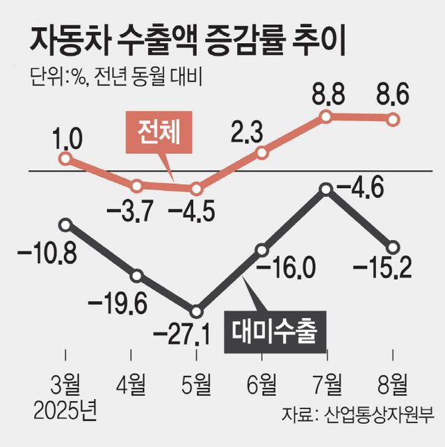 지난 7월 한국차에 대한 관세를 25%에서 15%로 낮추기로 한 한미 관세협상 타결로 부담이 다소 완화하리란 기대감이 나왔으나, 후속 협의가 난항을 겪으면서 다시 불확실성이 커지는 모습이다. 이를 반영하듯 대미 자동차 수출액도 지난 7월엔 전년대비 4.6% 감소에 그쳤으나 8월 들어 다시 감소 폭을 키웠다.