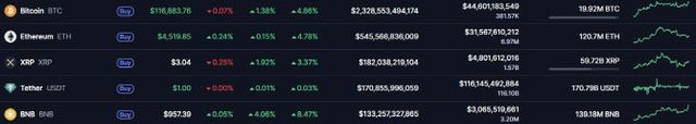 글로벌 가상자산 시황중계 사이트 코인마켓캡에 따르면 17일 오전 8시 7분 기준 비트코인 가격은 24시간 전 대비 1.38% 상승한 11만 6883달러에 거래됐다. 일주일 전과 비교하면 4.86% 올랐다. 같은 시간 이더리움은 전일 대비 0.24% 오른 4519달러에 거래됐다.