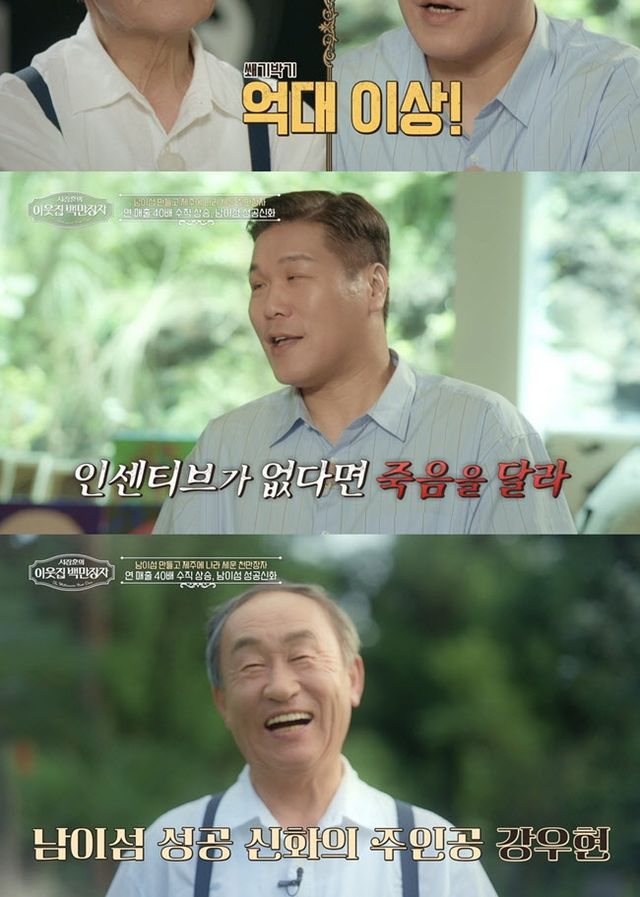 강우현은 2001년 공식적인 부채가 60억으로, 사실상 방치 상태였던 남이섬을 맡았다. 그런데 기적이 일어났다. 그가 운영하는 동안 남이섬은 122개국, 330만 명이 찾는 관광 명소로 탈바꿈했다. 연 매출은 무려 40배 급상승하며 폭발적인 성장을 이뤘다. 이 모든 성공 뒤에는 상상을 초월하는 비밀이 숨어 있었다. 강우현은 남이섬의 초대박 비결은 바로 “월급 100원”이라고 고백해 모두를 경악시킨다. 또 그는 “1년이 지나고 은행 가서 확인했더니 1200원 찍혀있었다”며 당시를 회상한다. ‘연봉 1200원’ 전설에 얽힌 남이섬 성공 신화의 비밀은 과연 무엇일지, 강우현의 인생 이야기는 ‘이웃집 백만장자’ 정규 첫 회에서 확인할 수 있다.
