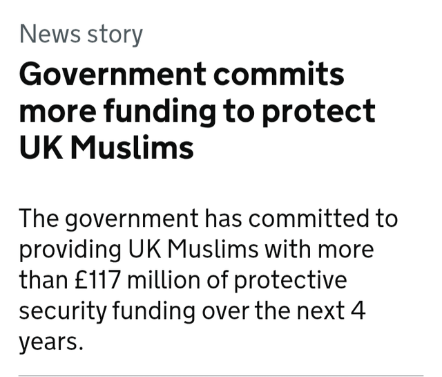 이 와중 영국 정부는 단순 지원금, 정착수당, 아동수당, 면세 혜택 등에 더해 무슬림 커뮤니티를 '혐오 범죄' 및 '인종 차별' 로부터 보호하기 위한 지원금을 한화 2300억 가량 따로 편성함.