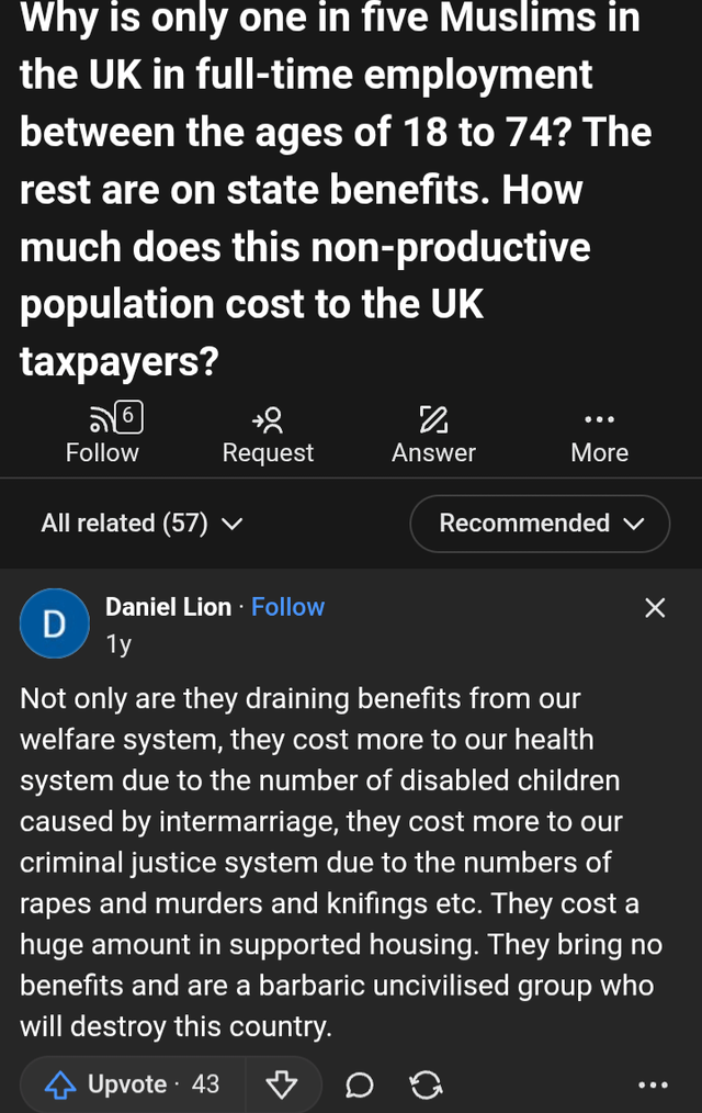 영국 거주하는 18세에서 74세 사이의 무슬림 중 단 20%만이 정규 직장을 가지고 있고 나머지는 모두 지원금을 타먹으며 생활 중. 당연히 영국 내에서 자립도 압도적인 꼴찌임.