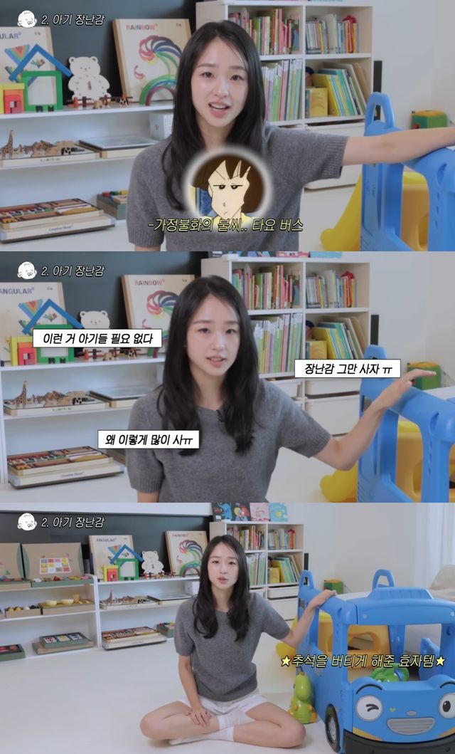 그는 "(버스가) 엄청 크지 않냐. 거실 한복판을 차지해서 '이런 거 아기들 필요 없다', '왜 이렇게 많이 사냐', '장난감 그만 사자'라고 했는데 오빠가 갑자기 주문을 해버린 거다"라고 전말을 밝혔다.