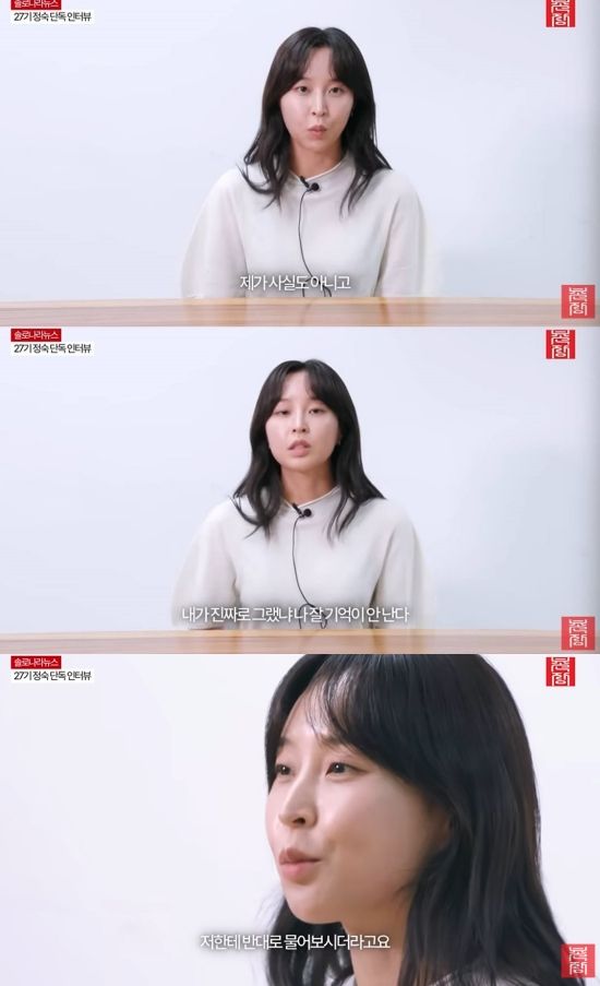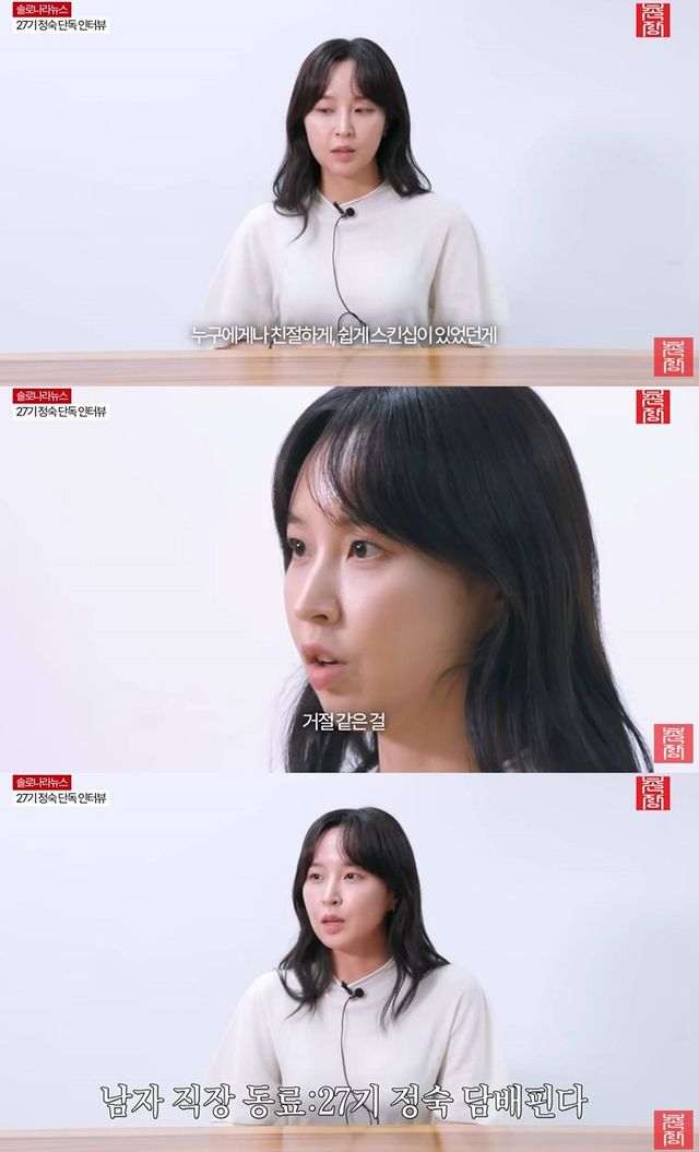 '흡연? 학폭? 모든 논란 종식시키러 온 27기 정숙'이라는 제목의 영상 속 정숙은 "남자 직장 동료가 블라인드(직장인 커뮤니티)에 제가 담배를 피운다고 올렸다. 동창이라고 주장하는 여자분은 '얘 학폭 있다'라고 올렸다"며 "그건 제가 해명할 거리가 아닌 것 같다. 사실도 아니고"라며 일축했다.
