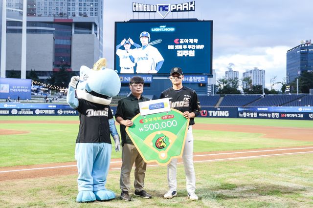 시상은 지난 10일 창원 SSG 랜더스전에 앞서 열렸고, 조아제약 송진근 경남영업소장이 맡았다.