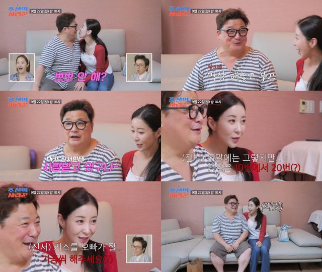 윤정수는 카메라 앞에서 망설이는 원진서에게 "드루와"라며 연상의 카리스마를 선보였다. 막상 원진서가 뽀뽀하자, 윤정수는 새빨개졌고 이를 VCR로 지켜보던 황보라는 "근데 얼굴은 왜 빨개지냐"면서 두 사람의 풋풋한 애정 행각에 아우성을 날렸다. 두 번째 뽀뽀가 이어지자, 제작진은 "원래도 뽀뽀를 자주 하시냐"고 질문했다.
