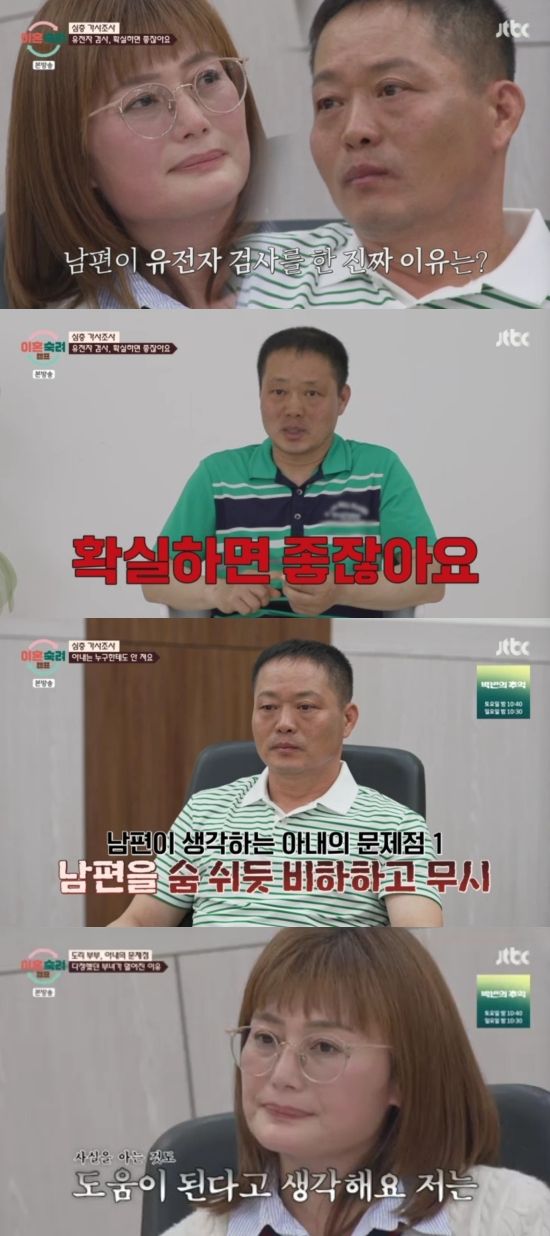 결혼 초, 아내가 딸을 낳자 유전자 검사를 했다는 남편은 "확실하면 좋지 않나. (아내가 다른 곳을) 왔다갔다했다"며 "미안할 것도 없다. 아이 엄마도 우리 자식이면 더 좋은 것 아니냐"고 답해 서장훈을 분노케했다.