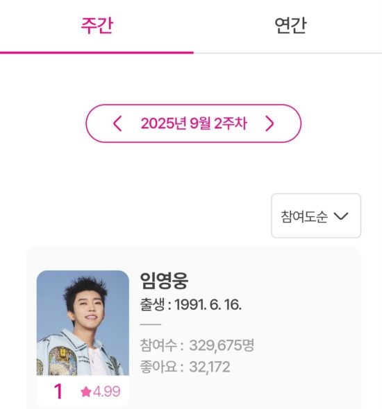 최근 아이돌차트에 따르면, 지난 9월 8일부터 9월 14일까지 집계된 평점랭킹에서 임영웅은 329,675표를 얻어 최다 득표를 기록했다.
