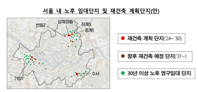 가장 먼저 재건축이 추진되는 서울 노원구 하계5, 상계마들 단지는 2029년 준공하고, 내년 사업 승인이 추진되는 중계 1단지 등에는 공공임대 외에 공공 분양까지 추진된다.