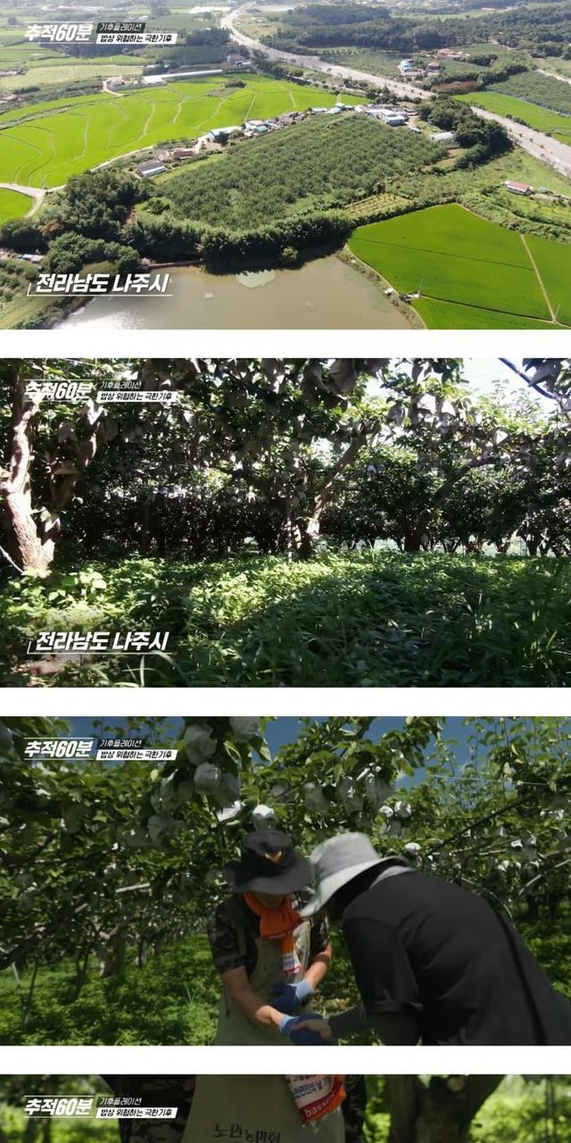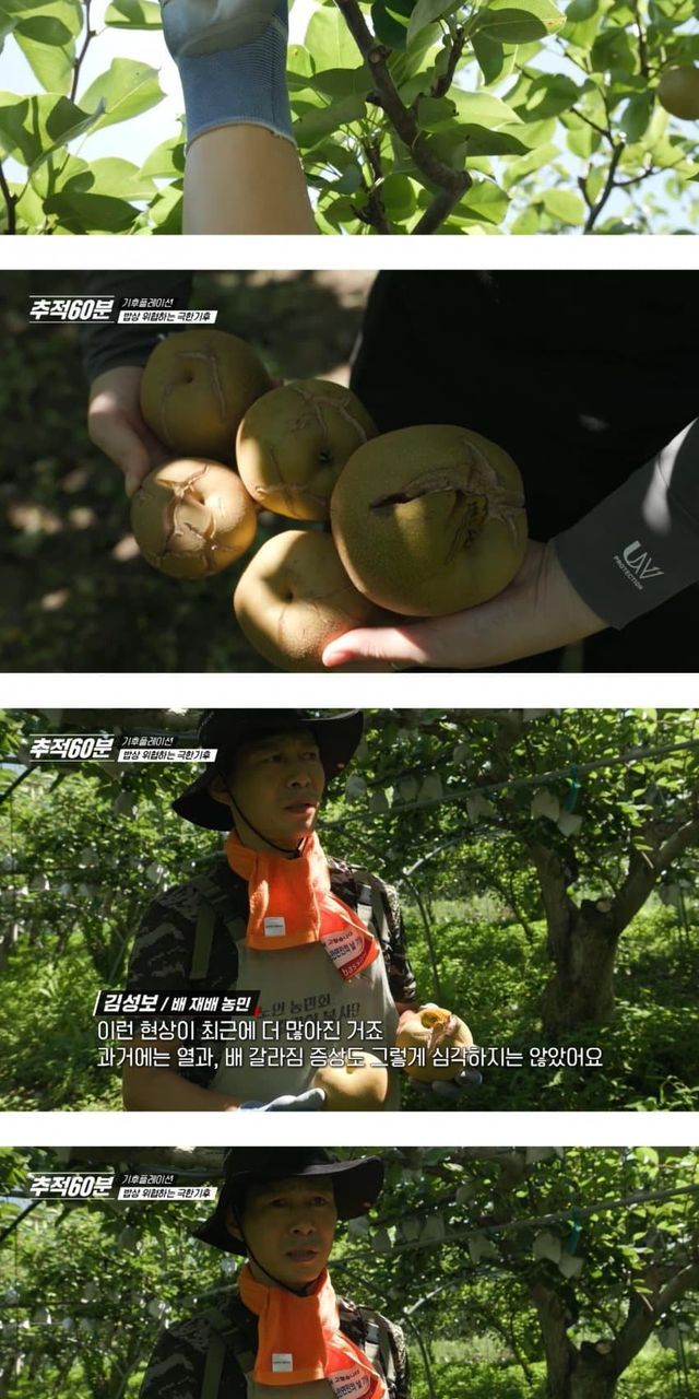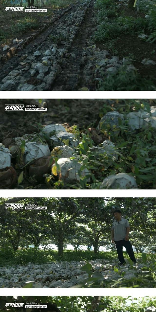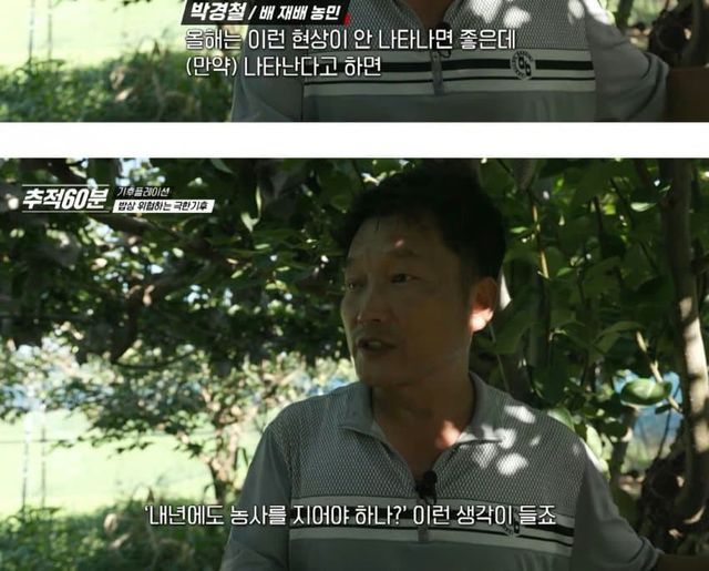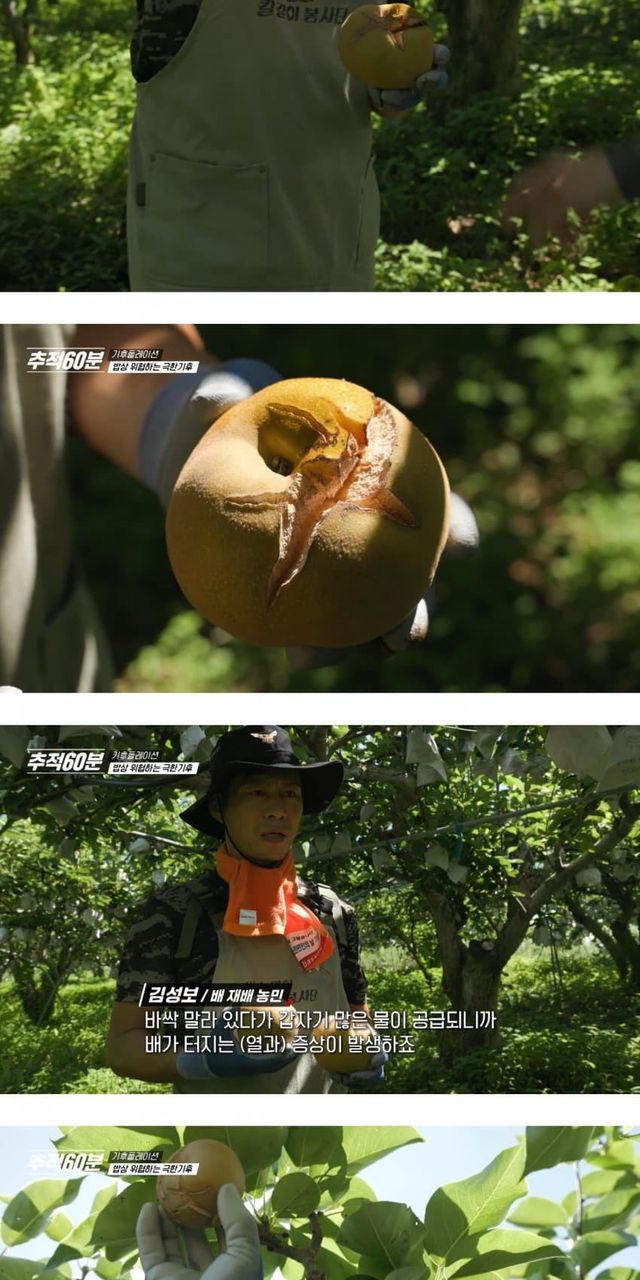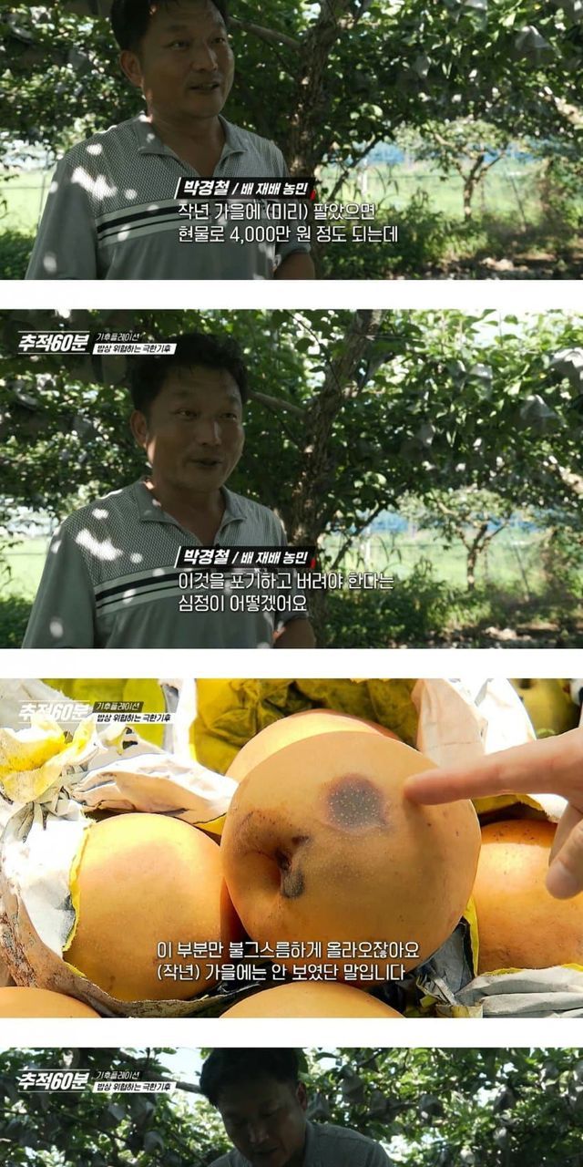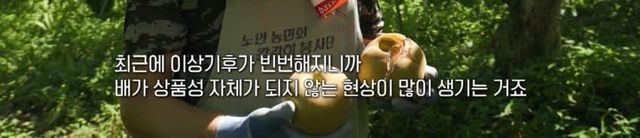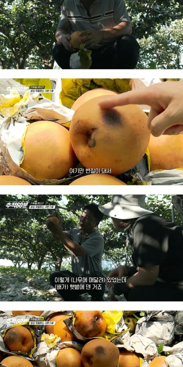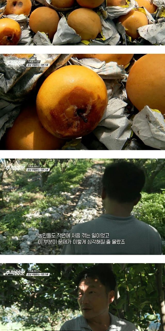 작년에 수확하고 저온창고에 보관한 배들에 병이 뒤늦게 와 일소에 걸린 상황