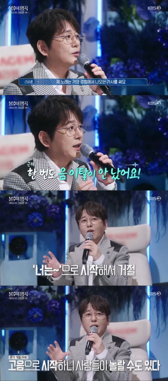 이날 신승훈은 14주 연속 1위를 차지한 메가히트곡 '보이지 않는 사랑'이 경험담을 바탕으로 만들어진 노랫말이라는 말에 "소문이다"라며 괜히 너스레를 떨었다. 이어 "제 노래는 거의 경험에서 나오는 걸 가사로 쓴다. 소설로 쓴 건 아니다. (가사처럼) 어제는 사랑을 했고, 오늘은 이별을 했고, 그다음 날 그리움이 찾아오더라"라고 해 감탄을 자아냈다.