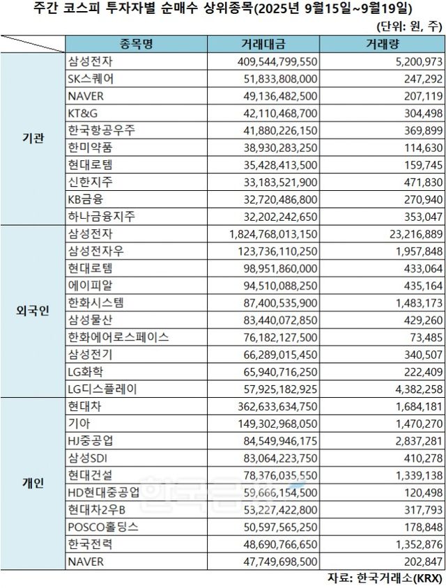 기관 '삼성전자'·외인 '삼성전자'·개인 '현대차' 1위 [주간 코스피 순매수- 2025년 9월15일~9월19일]