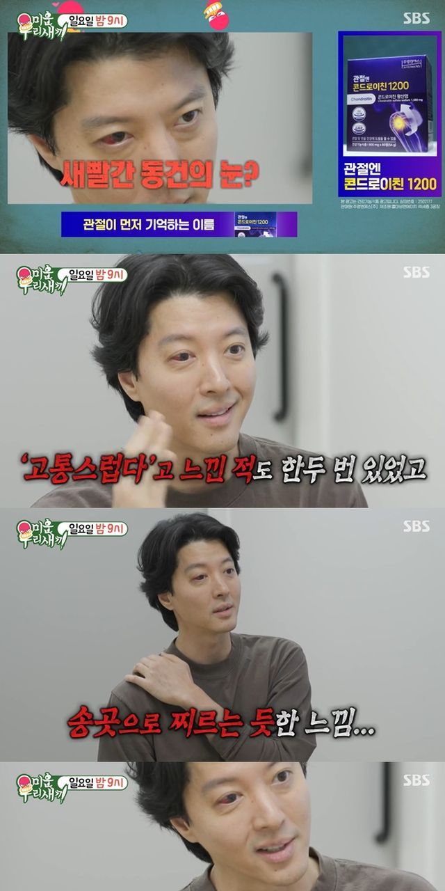 이어 공개된 화면에는 한쪽 눈이 붉게 충혈된 이동건의 모습이 포착돼 충격을 안겼다. 이동건은 "'고통스럽다'고 느낀 적도 한두 번 있었다. 승모건 아래를 송곳으로 찌르는 듯한 느낌"이라며 "숨만 쉬어도 찌르는 것"이라며 고통을 호소했다.