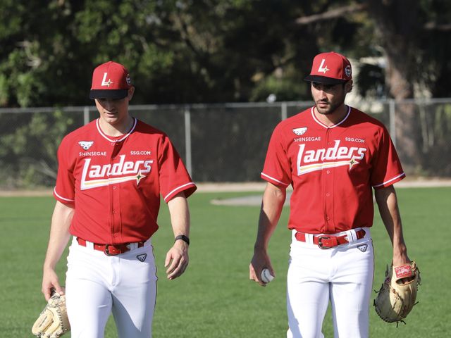 지난 2월 스프링캠프를 소화 중인 앤더슨(왼쪽)과 화이트. SSG 제공