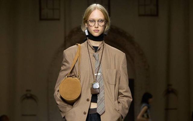 쁘띠 사이즈의 퀼팅 태비 숄더 백, 아가일 니트 가디건, 와이드 핏으로 연출한 테일러드 맨즈 런웨이 팬츠와 벨트, 바이커 부츠, 두 개의 스크류 드라이버 싱글 이어링은 모두 Coach.