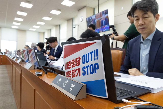 22일 서울 여의도 국회에서 열린 제429회국회(정기회) 행정안전위원회 제5차 전체회의에서 서범수(국민의힘) 야당 간사를 비롯한 위원들의 노트북에 피켓이 붙어있다. / 뉴스1