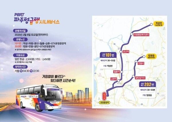 파주시가 내놓은 해법은 신도시와 구도심의 주요 거점을 연결하는 파주형 간선급행시내버스(PBRT, Paju Bus Rapid Transit)다. 올해 2월 개통한 파주형 간선급행시내버스는 적성‧문산 권역과 법원‧광탄 권역에서 신도시 내 지티엑스(GTX) 운정중앙역을 연계하는 두 개 노선으로, 3~5개 정류장만 경유해 이동시간을 30분 이내로 단축했다. 이 중 적성‧문산권 노선은 경의중앙선 3개 역(문산, 월롱, 금촌)에도 정차해 지티엑스(GTX) 뿐만 아니라 경의중앙선과의 접근성도 향상시켰다.