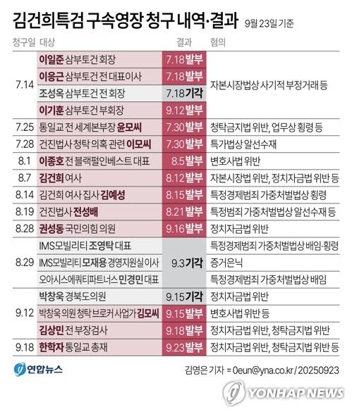 또한 같은 해 4~7월 윤 전 본부장과 공모해 건진법사 전성배 씨를 거쳐 김건희씨에게 다이아 목걸이와 명품 가방을 전달하며 교단의 현안을 청탁한 혐의(청탁금지법 위반)도 받는다.